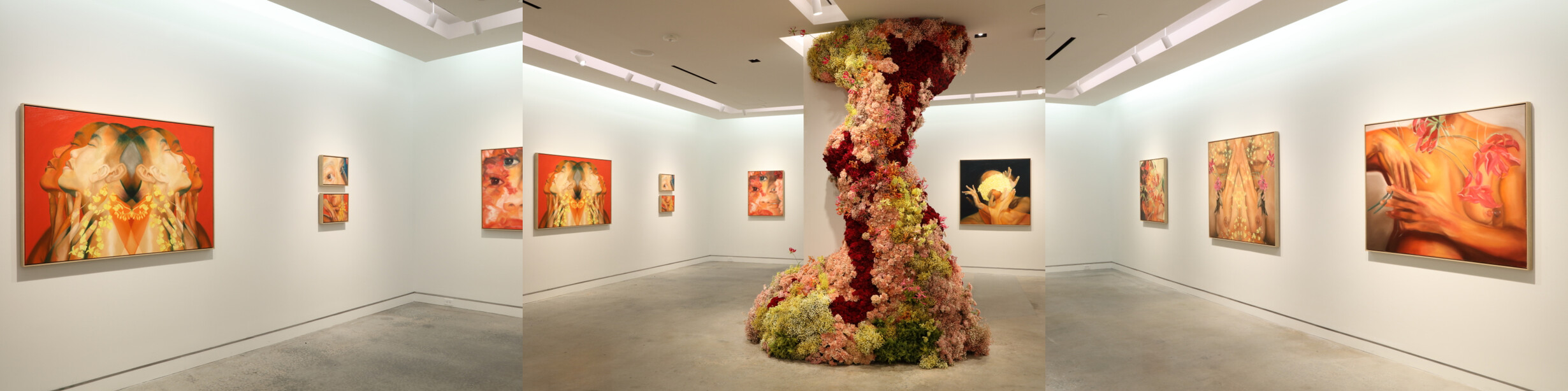 French Malagasy artist Célia Rakotondrainy, in collaboration with model and Dan Suleymanova, floral arrtist Carolin Ruggaber, and sound artist, Dylan Hunter Chee Greene, presented From one shore to another, my name might not be the same, an exhibition of paintings, floral installation and sound score, in the UTA Artist Space Atlanta. Through her art, Rakotondrainy poetically depicts the concept that identity is constantly evolving and dynamically composed of layers that are added, transformed, destroyed, and reformed over time. This body of work is the result of over two and a half years of interdisciplinary collaboration between Rakotondrainy and three women artists, nurturing conversations surrounding complex identities and frustrations over binary perceptions of self. To create the oil paintings in From one shore to another, my name might not be the same, Rakotondrainy began by digitally editing, manipulating, and deconstructing portraits of Suleymanova taken by Dempsey. For each image, Ruggaber created floral arrangements retracing Suleymanova’s origins and immigration journey in five countries. In the resulting paintings, the floral compositions superimposed over the body serve as identity markers, offering a prism through which the multidimensionality and multifacetedness of identity is not only revealed but also challenged, rejecting the notion that the self is fixed and immutable, rather fluid and ever-changing. ( Read the Full Write-up )